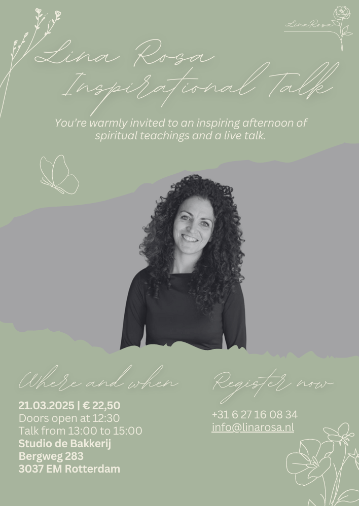 You are warmly invited to a gentle and inspiring morning guided by Lina Rosa, dedicated to awareness, inner growth, and freedom of being. In a safe and open space, we come together to explore deeper understanding through spiritual teaching, meditation, and shared experience.